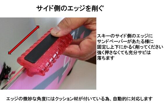 本品グリップにサビ用サンドペーパーを貼り、スノーボードのエッジに本品をあてて、スライドさせ、サビを落とします